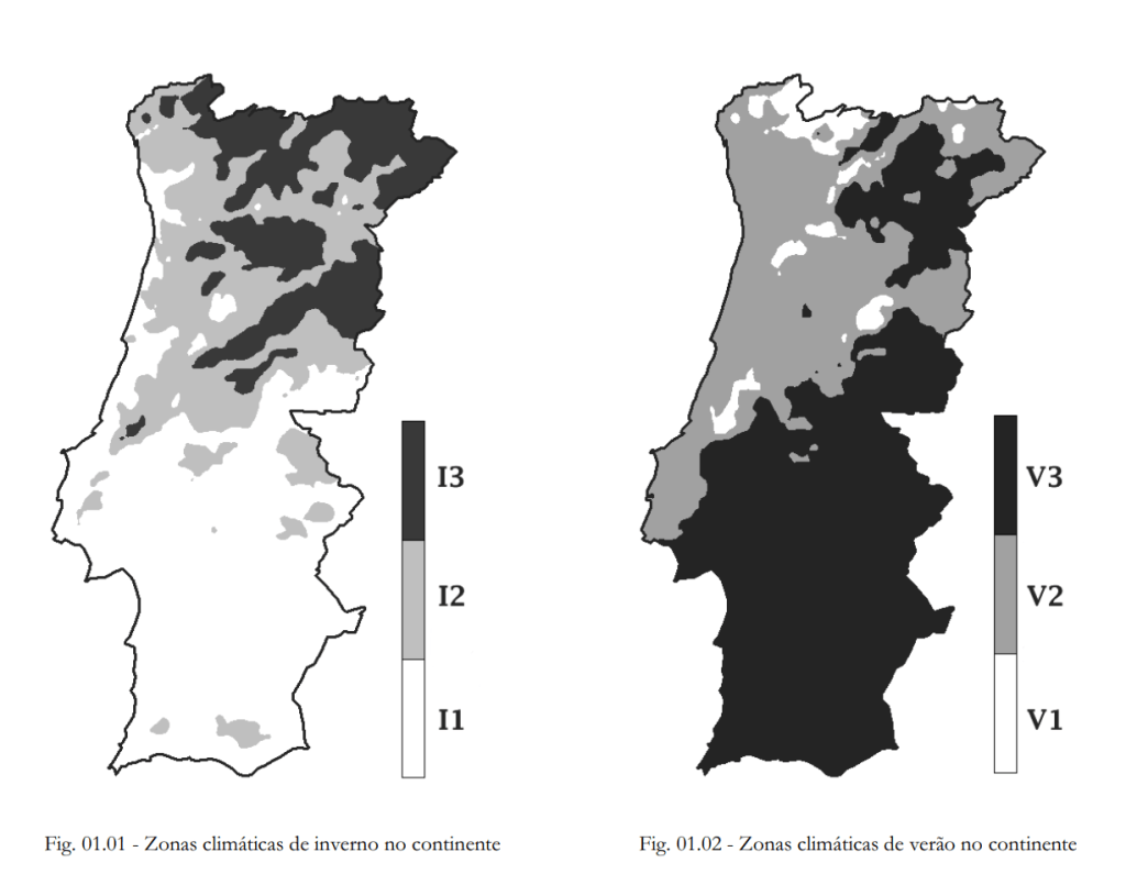 Na imagem seguinte, retirada do Despacho (extrato) n.º 15793-F/2013, podemos verificar os mapas climáticos de Verão e de Inverno de Portugal, organizados por zonas climáticas.